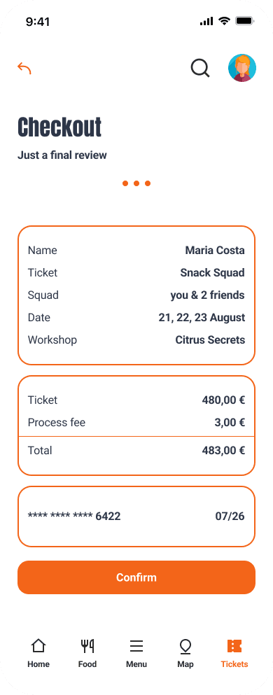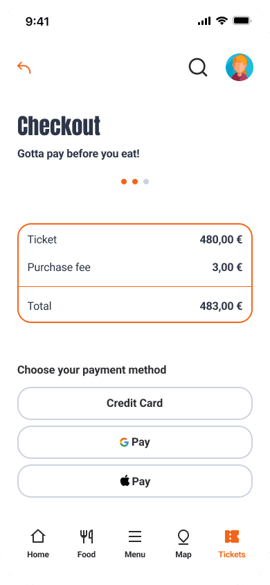 Simplified the checkout process into three steps and a ticket acessible in the profile.
