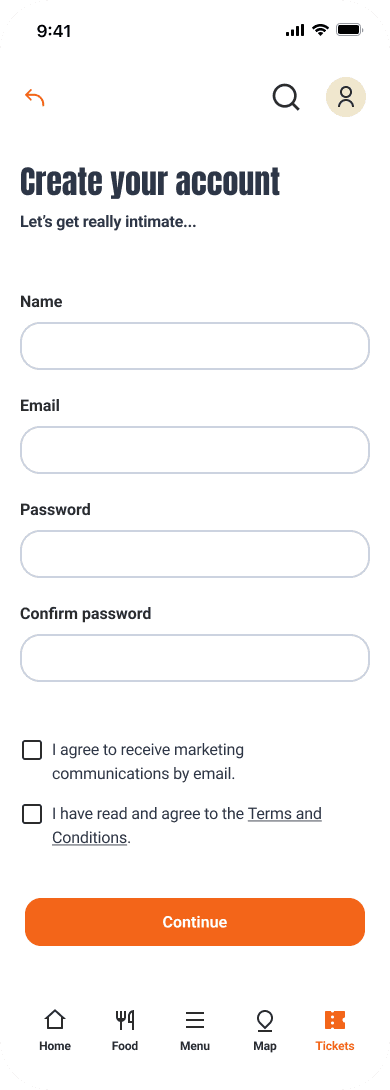 After going through the ticket buying process, the user is asked to create an account to finalise the process.